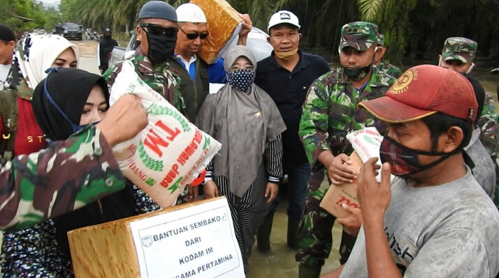 Dandim juga menyerahkan langsung bantuan sembako bagi warga korban banjir tersebut juga bantuan dari anggota dewan yang juga terjun langsung ke lokasi banjir.