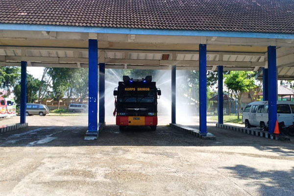 Kompi 2 Batalyon B Pelopor, dipimpin Wadanki 2 Ipda Hidayat selaku Dantim yang ditunjuk melakukan penyemprotan cairan disinfektan di terminal type A Kota Langsa, Rabu 15 Juli 2020.