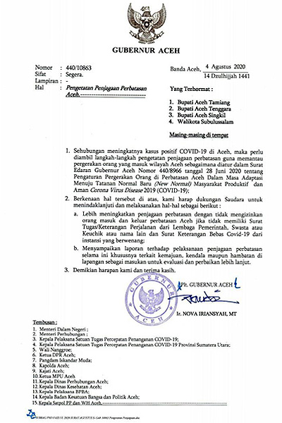 Surat tertanggal 4 Agustus 2020 itu, kepada kepala daerah diminta, dengan tidak mengizinkan orang keluar dan masuk Aceh. Jika tidak memiliki surat tugas atau keterangan perjalanan dari lembaga pemerintah, swasta atau kepala desa (keuchik). Termasuk surat keterangan bebas Covid-19 dari instansi yang berwenang.