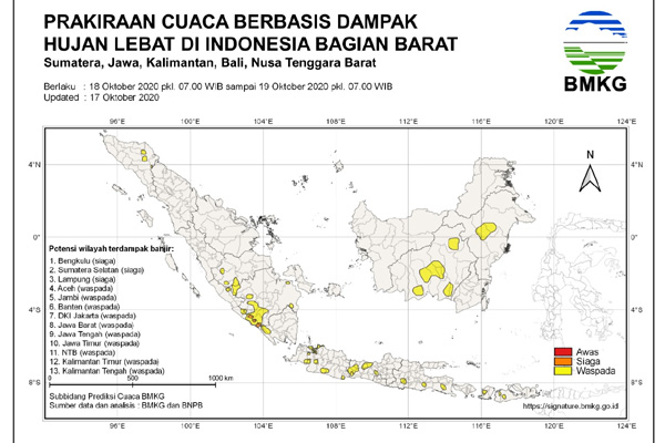 Berdasarkan informasi potensi dampak hujan lebat, Badan Meteorologi, Klimatologi dan Geofisika (BMKG) mencatat tiga provinsi tersebut dengan status siaga. Prakiraan tersebut berlaku pada analisis cuaca pada 18-19 Oktober 2020.