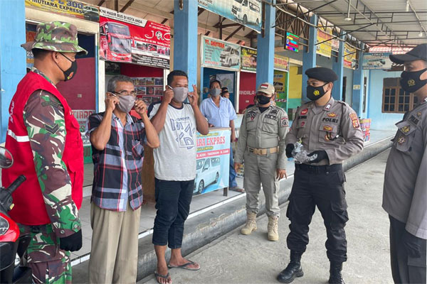 Masyarakat yang tidak menggunakan masker diberi imbauan, peringatan dan diberikan masker.[Antoedy]