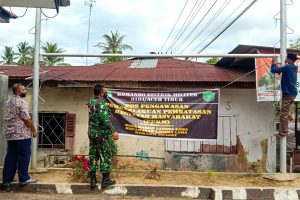 Sementara itu, Babinsa Koramil Langsa Timur, Sertu Darlianto bersama perangkat Desa Baroh Kecamatan Langsa Lama memasang spanduk langkah PPKM, Minggu 18 April 2021.