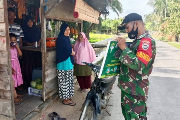 Kedua Babinsa ini mensosialisasikan dan memberikan edukasi PPKM berbasis Mikro kepada para pelaku usaha dan pembeli yang sedang berinteraksi termasuk kepada pekerja bangunan maupun petani.