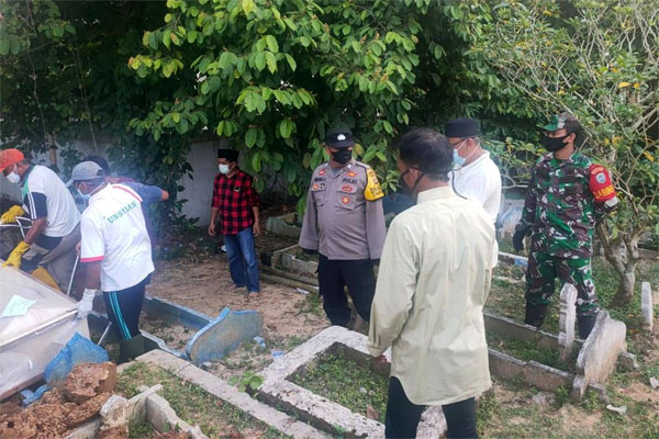 Pelaksanaan pemakaman dengan Prokes petugas Covid-19 dibantu personel Babinsa Koramil Kejuruan Muda, Serda Lamres Situmorang, Kanit Intel Bripka Syahuddin Syah dan Bhabinkamtibmas Aiptu Hendra, Datok Desa Purwodadi, Gamal Eka Putra, Imam Desa Darisman, relawan dan warga desa.