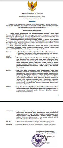 Dalam salinan instruksi walikota yang diterima disebut dalam rangka pencegahan dan penanggulangan pandemi Covid-19 dan menjaga kesehatan masyarakat. Diperlukan pelaksanaan vaksinasi bagi ASN dan Non ASN.