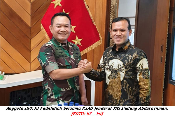 halaman7.com – Jakarta: Anggota Komisi I DPR RI asal pemilihan daerah Aceh Fadhlullah SE menyampaikan kondisi Aceh terkini kepada Kepala Staf Angkatan Darat (KSAD) Jenderal TNI Dudung Abdurrahman di Mabesad, Jumat 4 Maret 2022.
