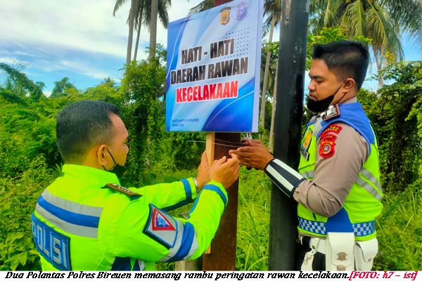 halaman7.com – Bieruen: Sejumlah lokasi rawan kecelakaan lalu lintas di jalan raya dalam Kabupaten Bireuen diberi tanda oleh Polisi dengan memasang rambu berupa pamplet imbauan kecelakaan lalu lintas (Laka lantas).