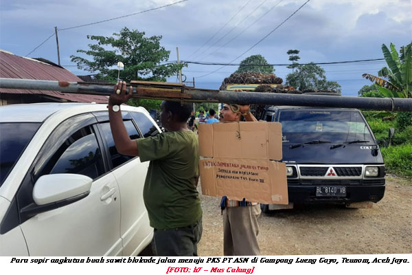 halaman7.com – Calang: Belasan supir angkutan kelapa sawit lakukan blokade jalan menuju ke perusahaan kelapa sawit atau PKS milik PT Agro Sinergi Nusantara yang terletak di Desa Lueng Gayo Kecamatan Teunom Aceh Jaya, Selasa 31 Mei 2022, sore.
