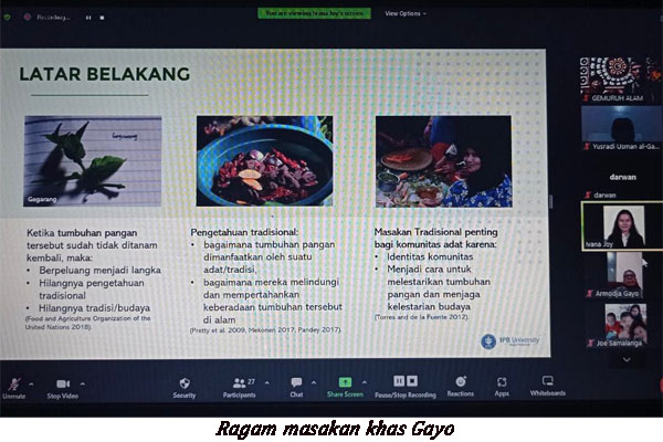 halaman7.com – Banda Aceh: “Ini angka yang banyak, bukan kecil. Sementara, ada 25 masakan tradisional yang penting bagi masyarakat Gayo berdasarkan Smith’s Salience Index,” kata Ivana Joy Pauline Pangaribuan, mahasiswi Magister Konservasi Biodiversitas Tropika Institut Pertanian Bogor (IPB) yang jadi pembicara Bincang Kuliner Pusat Kajian Kebudayaan Gayo, Jumat malam 3 Juni 2022.