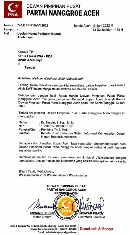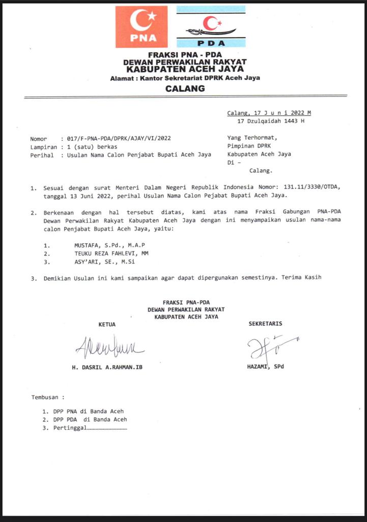 Syamsuddin menambahkan, dalam surat dari Menteri Dalam Negeri (Mendagri) nomor: 131.11/3330/OTDA tanggal 13 Juni 2022 perihal usulan nama calon Pejabat Bupati Aceh Jaya ditujukan kepada lembaga DPRK Aceh Jaya.