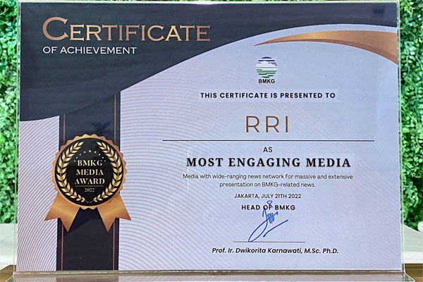 halaman7.com – Jakarta: Lembaga Penyiaran Publik Radio Republik Indonesia (LPP RRI) meraih penghargaan dari Badan Meteorologi, Klimatologi dan Geofisika (BMKG) sebagai Most Engaging Media, atau media yang paling banyak melibatkan publik dalam berbagai programnya.