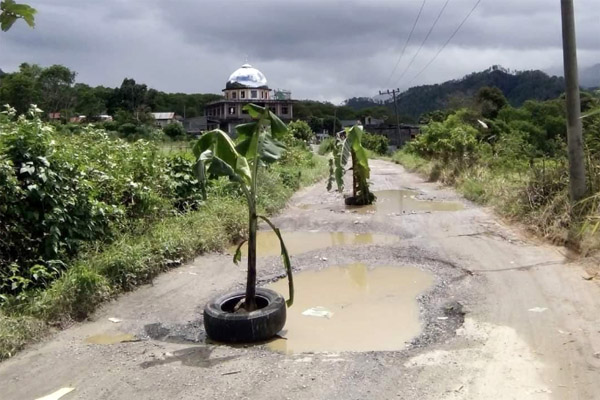 halaman7.com Aceh Tengah: Masyarakat Kampung Genuren, Kecamatan Bintang, Kabupaten Aceh Tengah menanam pohon pisang di tengah jalan, Rabu 16 Nopember 2022. Hal tersebut lantaran akses jalan di beberapa titik tak kunjung diperbaiki.