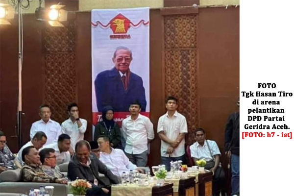 halaman7.com – Banda Aceh: Pemasangan foto almarhum Wali Nanggroe, Tgk Hasan Ditiro dan Panglima GAM, almarhum Tgk Abdullah Syafi’I pada acara pelantikan DPD Partai Geridra Aceh banyak kecaman dari berbagai kelompok masyarakat. Karena dinilai tidak etis, politis dan menimbulkan ketersingungan dari kombatan GAM.