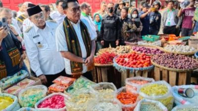Moeldoko didampingi Forkopimda Langsa mengunjungi pasar. Guna mengecek langsung harga serta ketersediaan bahan pokok.