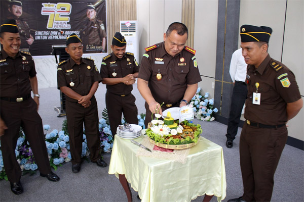 Kajari memotong tumpeng pada peringatan Persaja di Kejari Langsa.[FOTO: h7 - dok jejari langsa]