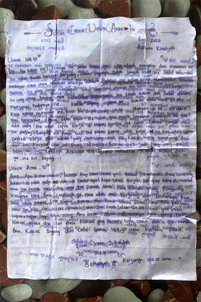 Ama kalo udah tamat SMA nanti, kakak mau buka usaha sama ama. Ama panjang umur ya. Kita cari rezeki sama-sama dan kalau udah sukses, ama gak usah capek-capek lagi cari uang. Ama baek kali. Pokoknya ama yang terbaik. Kakak minta doa dari ama. Kakak gak pernah lupa doain ine sama ama. Kakak sayang sama ine dan ama, karena Allah.