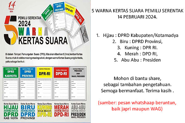 Sekiranya, pewan singkat di wa, wag dan medsos tersebut, berasal dari pihak resmi, baik KPU atau Bawaslu, kiranya perlu dilakukan penjelasan mendetil lagi. Bahwa warna di kertas suara bukan berarti warna pilihan dari partai tertentu kontestan Pemilu.