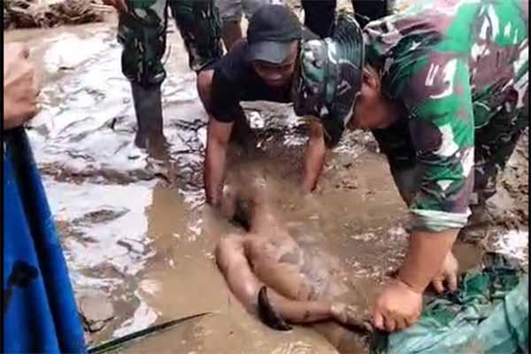Mayat pria yang diduga korban banjir bandang ini ditemukan tanpa mengenakan pakaian (baju), dengan badan tertimbun lumpur banjir.