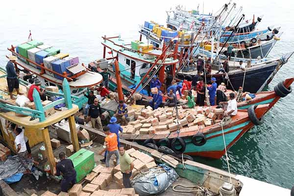 Proses pelansiran dilakukan menggunakan kapal motor milik warga untuk memindahkan bantuan secara bertahap dari KRI Gilimanuk ke daratan.