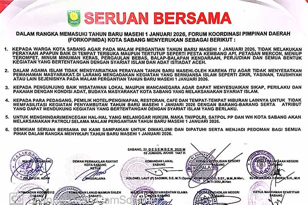 dIjelaskan, seruan bersama ini bertujuan untuk menjaga ketertiban umum sekaligus menegaskan pentingnya nilai-nilai agama dan budaya dalam kehidupan masyarakat Kota Sabang, khususnya pada momentum pergantian tahun.