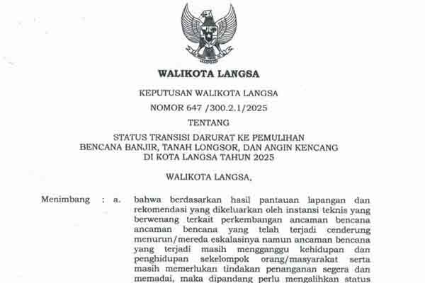 Status Transisi Darurat ke Pemulihan Bencana Banjir, Tanah Longsor, dan Angin Kencang di Kota Langsa 2025 diberlakukan selama 30 hari terhitung mulai 24 Desember 2025 sampai dengan 22 Januari 2026.