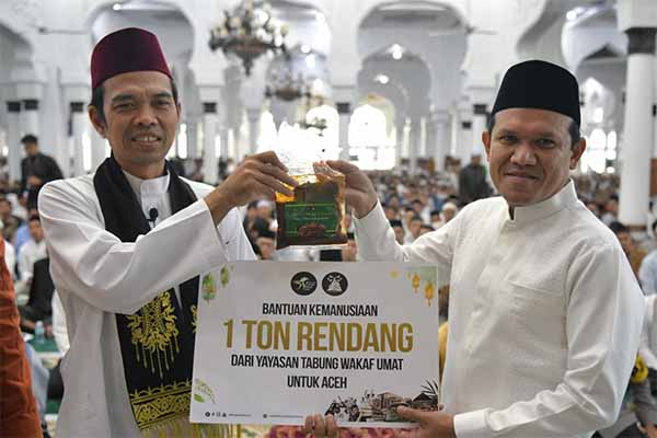 Pada kesempatan tersebut, UAS turut menyerahkan bantuan kemanusiaan berupa 1 ton daging rendang, 10 ton beras, 1 mobil colt diesel pakaian layak pakai, mushaf Al-Qur’an, buku Iqra.