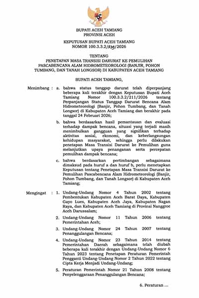 Bupati Aceh Tamiang, Drs. Armia Pahmi MH dalam pertimbangannya menyebutkan meskipun ancaman bencana telah menurun. Sejumlah wilayah masih mengalami gangguan aktivitas sosial dan ekonomi akibat dampak banjir.