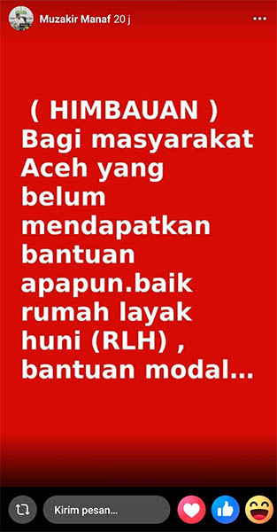 “Pemerintah Aceh tidak pernah melakukan penyaluran bantuan maupun pemenuhan syarat bantuan melalui media sosial. Jika ada akun yang mengatasnamakan pimpinan pemerintah dan menawarkan bantuan, itu dipastikan hoaks,” ujar Akkar, Kamis 5 Februari 2026.