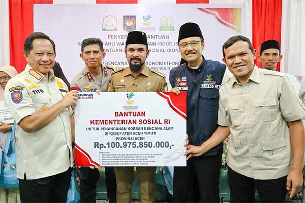 halaman7.com – Aceh Timur: Kementerian Sosial (Kemensos) memberikan bantuan Rp100 miliar bagi para korban bencan di Aceh Timur. Bantuan tersebut diserahan secara simbolis oleh Menteri Dalam Negeri,  Tito Karnavian dan Menteri Sosial, Saifullah Yusuf.