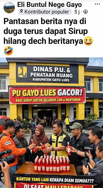 Dalam postingannya, Eli Buntul Nege Gayo menulis, “Pantas Beritanya Diduga terus Dapat Sirup Hilang Dech Berita.” dengan menambah emoji tertawa. Tulisan ini juga di lengkapi postingan foto ilustrasi karya IA pembagian sirup di depan Kantor PUPR.